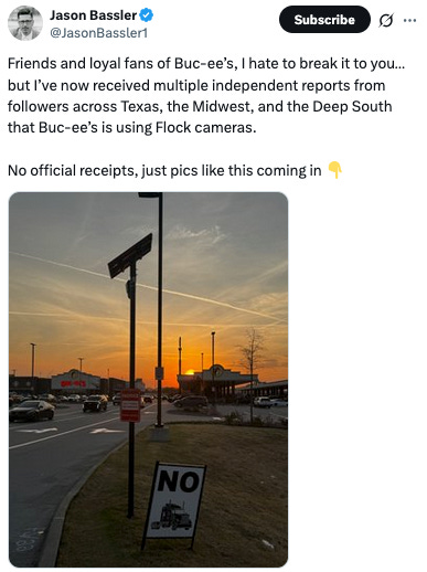 On a related note, privacy advocate Jason Bassler recently posted on X that he has received multiple reports suggesting Buc-ee’s locations may be using Flock license plate reader cameras.