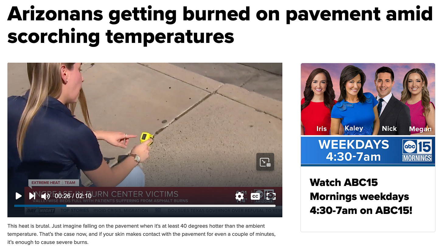 IT WAS NEVER ABOUT THE FLIP-FLOPS.Local media report it's so hot outside that flip-flops will melt. So... I tested it out.Jul 26, 2023∙ PaidShareTuesday morning. In July. The first news item in my feed is….The story includes an alarming quote from Phoenix Fire Captain Kimberly Ragsdale:"You can walk outside, and your flip-flop can melt. Your shoe can melt.”See the statement here….Continue reading this post for free, courtesy of Jen's Two Cents..Claim my free postOr purchase a paid subscription.PreviousNext
