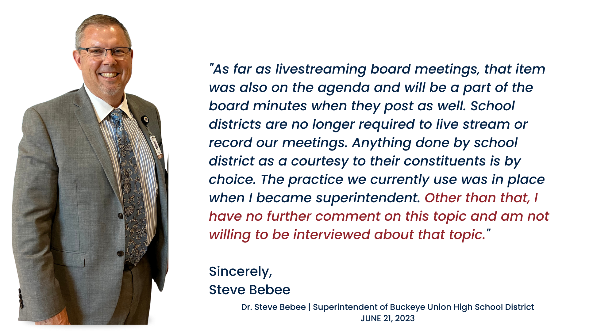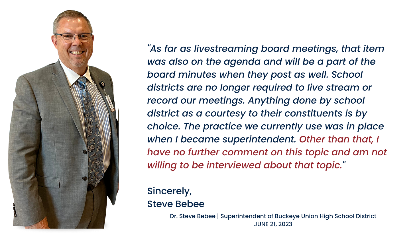 The Superintendent of the Buckeye Union High School District doesn't want to be interviewed about why he is not in favor of archiving live streams of Governing Board meetings.