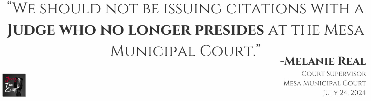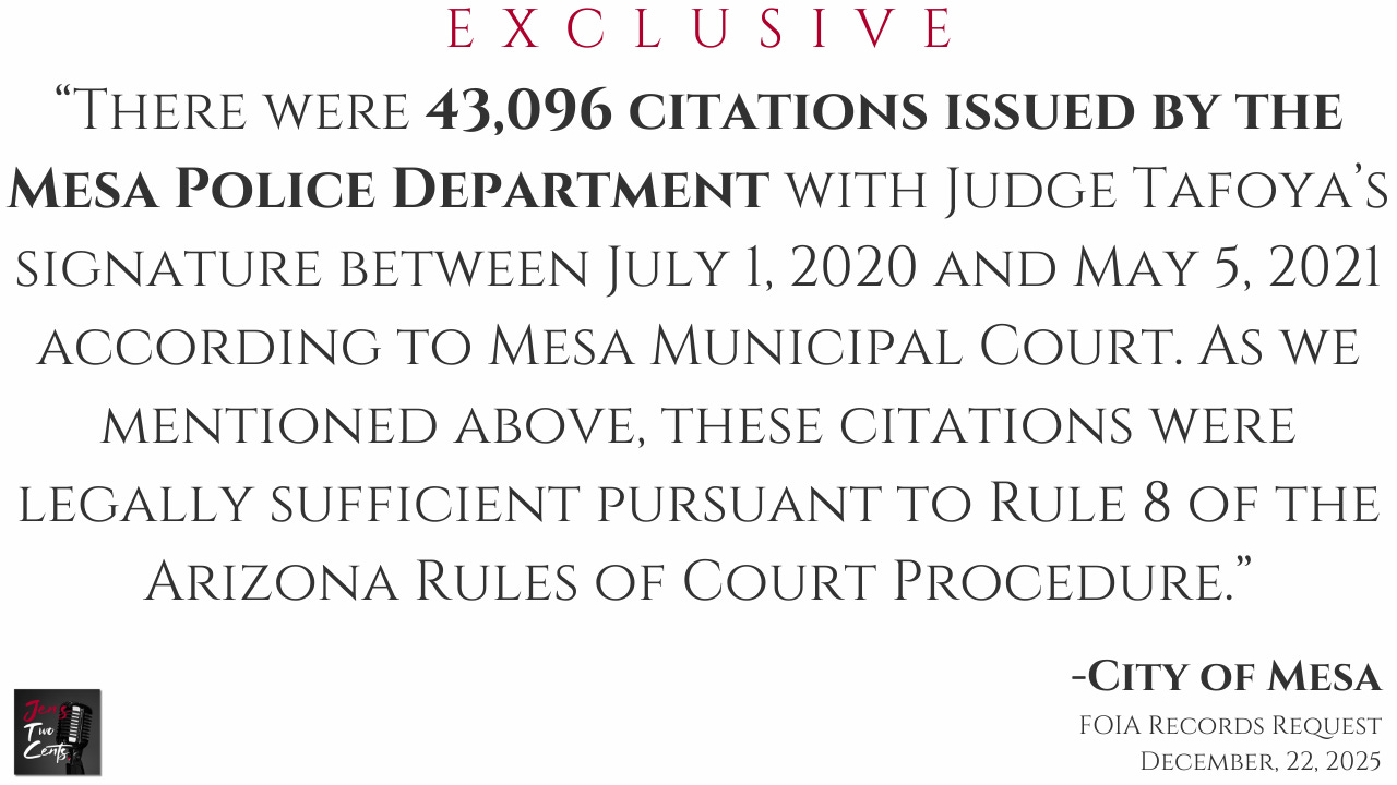 “There was a prior occurrence after Presiding City Magistrate Judge Matias (Matt) Tafoya retired June 30, 2020 and Judge John Tatz became Presiding Magistrate July 1, 2020. Judge Tafoya’s signature was used for several months after his retirement. There were 43,096 citations issued by the Mesa Police Department with Judge Tafoya’s signature between July 1, 2020 and May 5, 2021 according to Mesa Municipal Court. As we mentioned above, these citations were legally sufficient pursuant to Rule 8 of the Arizona Rules of Court Procedure.”