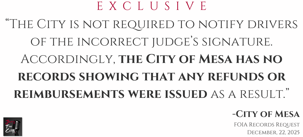 New public records obtained from the City of Mesa confirm that 2,446 photo-enforcement citations issued by the Mesa Police Department between April and September 2024 carried a judicial signature not belonging to the presiding magistrate at the time.
