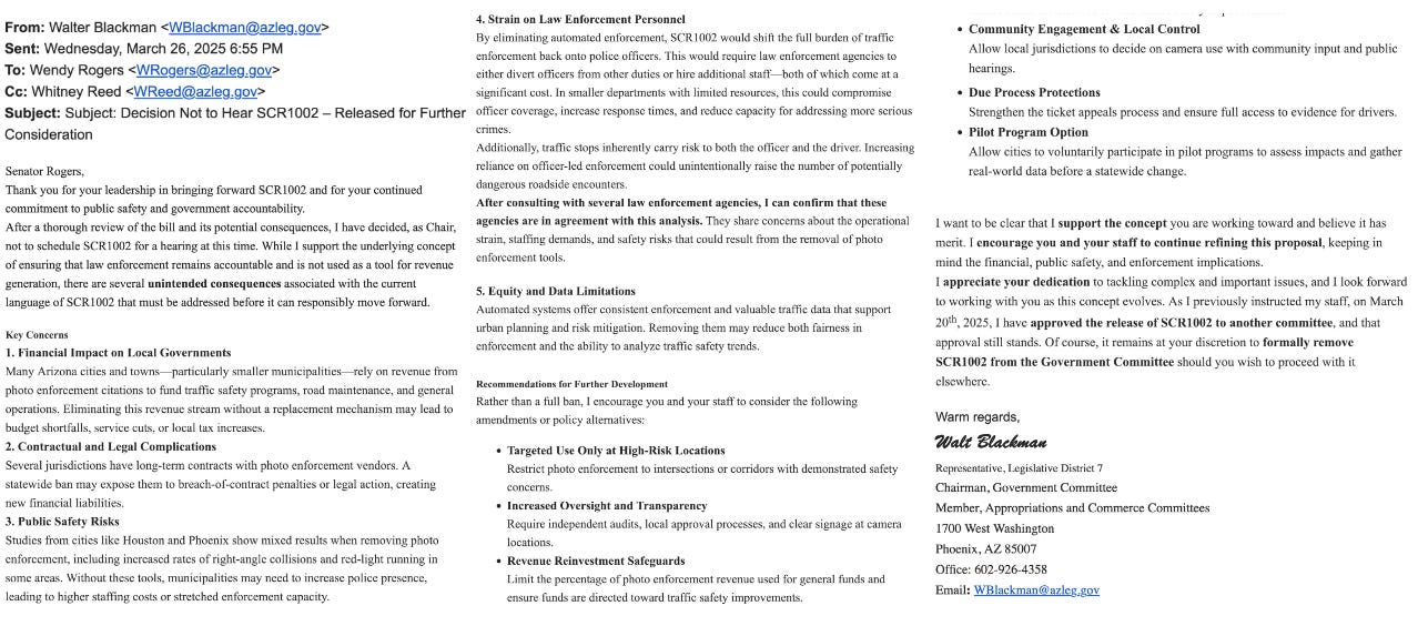 The cat was out of the bag this spring. In a March 26, 2025 email, Rep. Walt Blackman told Sen. Wendy Rogers he wouldn’t schedule SCR1002 for a hearing, citing “unintended consequences” in its current language. Chief among them: the financial hit to local governments, especially smaller municipalities that rely on photo radar revenue to fund road maintenance, traffic safety programs, and even general operations. He warned that cutting that revenue could mean budget shortfalls, service cuts, or higher local taxes.