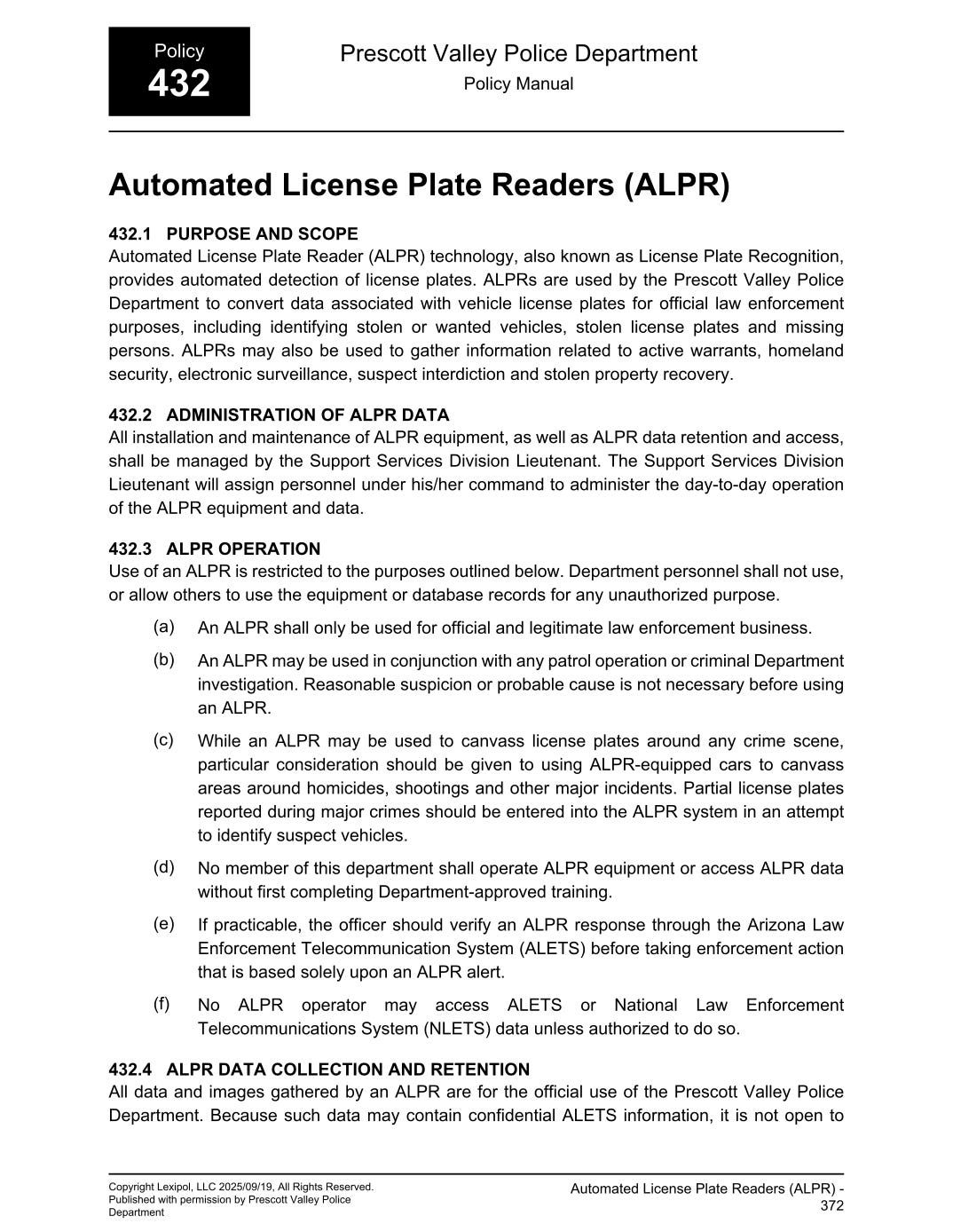 Prescott Valley Police Department ALPR Policy ManualThe following document was provided by the Prescott Valley Police Department.Nov 04, 2025∙ Paid1ShareContinue reading this post for free, courtesy of Jen's Two Cents..Claim my free postOr purchase a paid subscription.PreviousNext