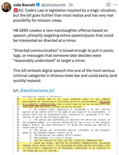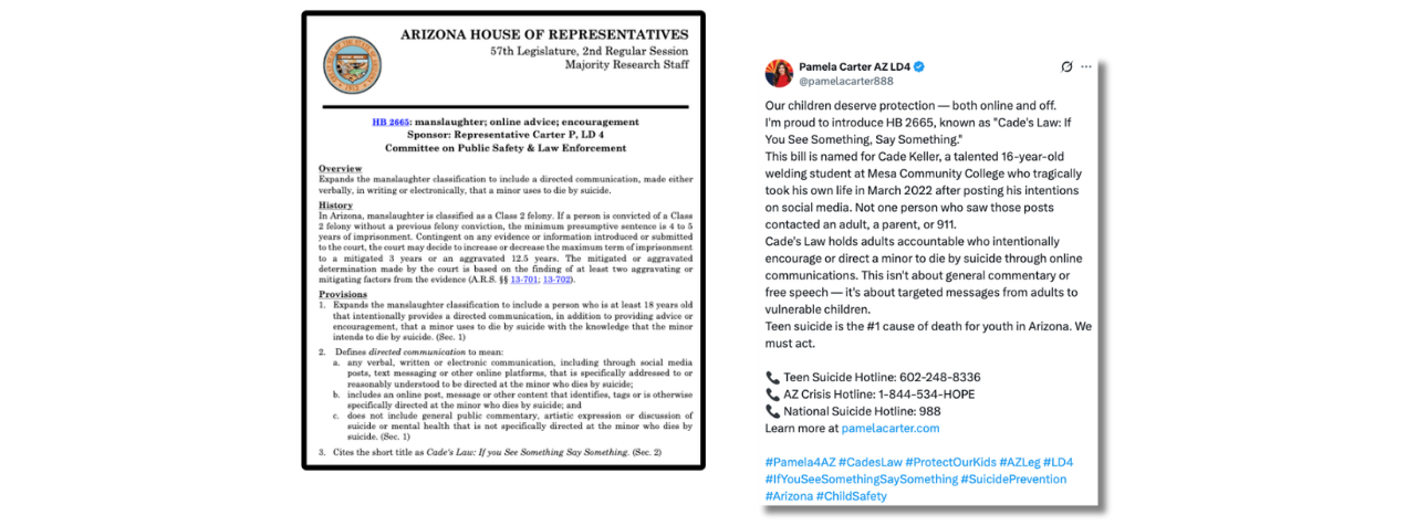 HB 2665 would expand Arizona’s manslaughter statute to include certain online communications directed at minors. Under the bill, anyone of at least 18 years of age could face manslaughter charges if they intentionally send a direct communication — verbally, in writing, or electronically — encouraging or advising a minor to die by suicide, and the minor later uses that communication to take their own life.