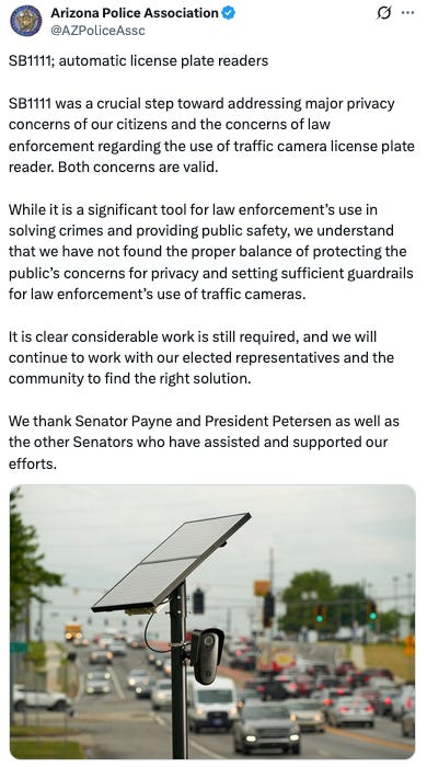 This week, the Arizona Police Association issued a public statement regarding Arizona Senate Bill 1111, which addresses the use of automatic license plate readers and traffic camera data. In the statement, the association described the bill as an important step toward addressing both privacy concerns raised by citizens and operational concerns raised by law enforcement agencies.